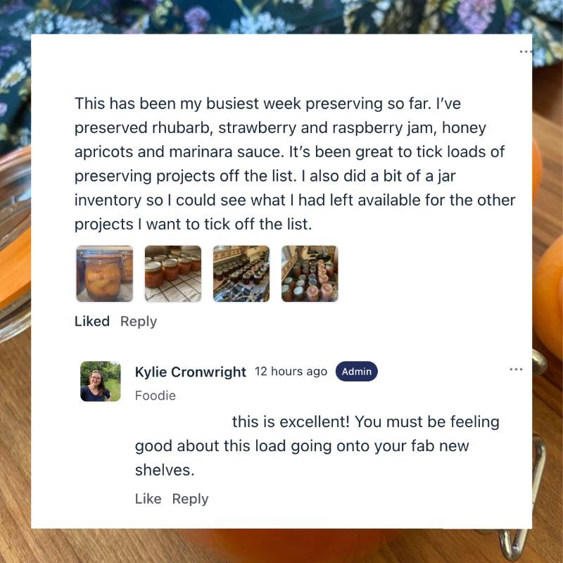 Ask questions, share what you're making, celebrate pantry wins, and join seasonal challenges that help keep your preserving goals on track.